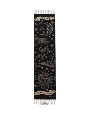 Add a touch of celestial charm to your everyday style with our Freya Celestial Jacquard Black Scarf. Beautifully woven with an enchanting moon and sun illustration, featuring a Pegasus soaring through the stars and the uplifting message "Anything is Possible" on a striking black base. Reversible to solid grey with twisted fringe details. Wear it as a statement scarf or cosy wrap; however you style it, this jacquard piece brings a little wonder to every look.