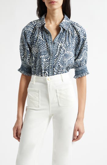 Puffed sleeves and shirred details gentle this button-up shirt cut for an easy, swingy fit that makes the most of the airy, textured cotton fabric.