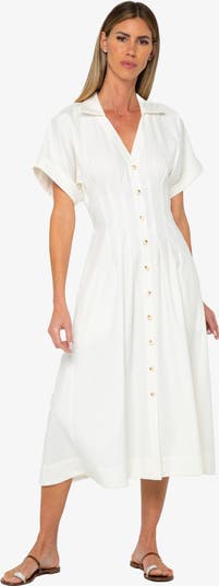 The Freya Dress in Stretch Viscose Linen is a relaxed midi silhouette with a soft collared neckline and short sleeves. Designed with a button-front closure and gentle waist shaping, it flows into an easy A-line skirt. Crafted in stretch viscose linen, it offers breathable comfort with a polished, everyday elegance.