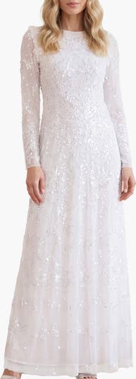 The Freya Long Sleeve Gown. Featuring intricate sequin embellishment with graceful scalloped borders, this long sleeve gown captures the glow of late summer evenings. The fitted bodice and flowing full-length skirt create a flattering, feminine shape. A timeless piece for luxury evening wear.