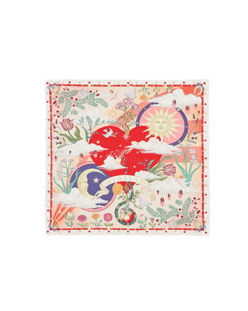 Bring hope and light to your wardrobe with the Pink Freya Narrative Square Scarf. Featuring a delicate illustration of suns, doves, and foliage, it tells the story of Freya and her message of love. Crafted in soft, silky fabric, this square scarf adds a luxurious, wearable touch to any outfit.