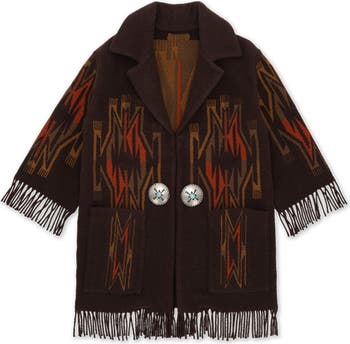 The FREYA is a Fortela piece that comes from Alessia Giacobino's vintage archive. The garment is made with a composition of 85% wool and the remaining 15% cotton. The entirely Italian production ensures a manufacturing excellence that is reflected in every detail of the garment, underlining how it was created to last over time and evolve together with the wearer. The regular fit offers comfort and freedom of movement without sacrificing style. The Navajo-inspired fabric design is an exclusive project created by the historic weavers that Fortela has been working with for years. The jacket embodies the elegance of the fringed jacket, crafted from high-quality wool. It features a fringe pattern along the sleeves and hem, giving it a distinctive and sophisticated touch. Versatile for any occasion, the addition of two central metal conchos with a turquoise paste insert further enhances its appeal. On the back, the iconic Fortela stitching, made with orange thread, embodies the brand's philosophy: each piece is created to last and age together with the wearer, carrying with it a piece of history revisited in the light of Alessandro Squarzi's inspiration and study.
