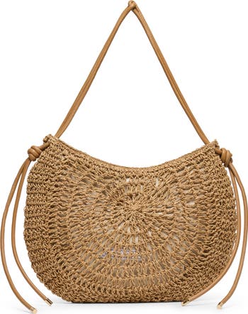 Artfully woven raffia and smooth faux-leather trims create textural interplay on a roomy shoulder bag featuring a half-moon silhouette and tubular, knotted strap.