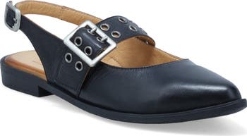 A pair of adjustable straps deliver a customized and secure fit on a pointy-toe mary jane shaped from rich leather and set on a cushioned footbed for optimal comfort.