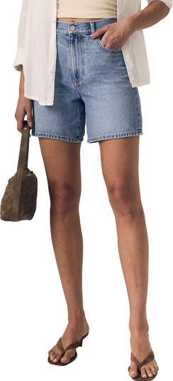 Effortlessly cool for warm weather, these nonstretch-denim shorts have a high waist, a straight-cut silhouette and a mid-thigh length that's right on trend.