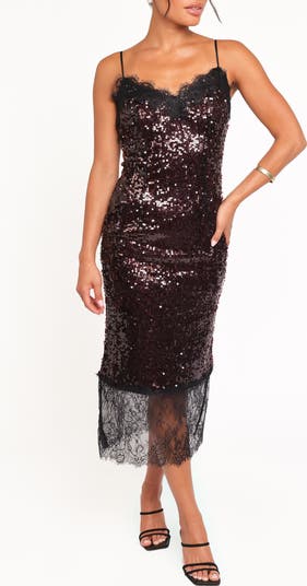 Slipdress style gets a sparkling upgrade in this night-out option trimmed in eyelash lace and drenched in shimmering sequins.