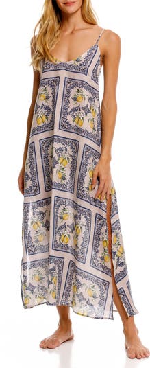 A captivating print covers a breezy linen nightgown featuring adjustable straps and a long silhouette that's perfectly chic for daytime too.