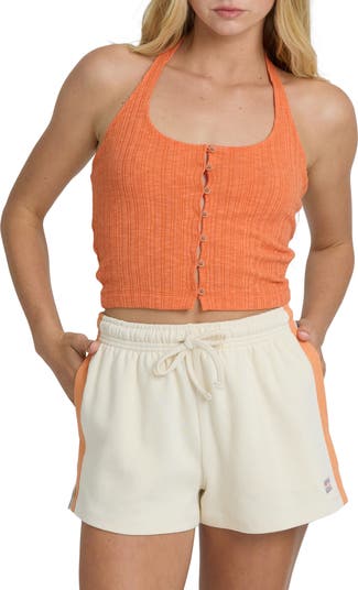 A front button-and-loop closure gives a unique touch to this halter top made from a lightweight ribbed knit and cut to a cute abbreviated length.