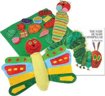 2 years & up. Engage your children in reading with this classic Friendly Caterpillar Story Props and Book. Children will enjoy playing with the props as the very familiar caterpillar eats its way through the timeless story The Very Hungry Caterpillar. Much like the caterpillar in the story, the prop turns into a beautiful butterfly. Since its publication in 1969, its distinctive design, featuring a caterpillar munching through die-cut pages that illustrate the different foods it eats, has made it a beloved classic in children's literature. This storytelling set contains 16 props and a hardback book. Surface wash. Butterfly measures 15"H.