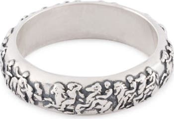 A stackable band ring crafted from sterling silver is given dimension with an oxidized finish and an intricate design.