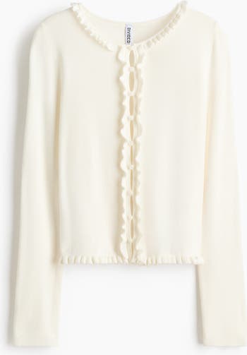 Fitted cardigan in a fine rib knit made from a viscose blend. Features a round neckline, buttons down the front and a frill trim around the neckline, along the button band and at the hem.