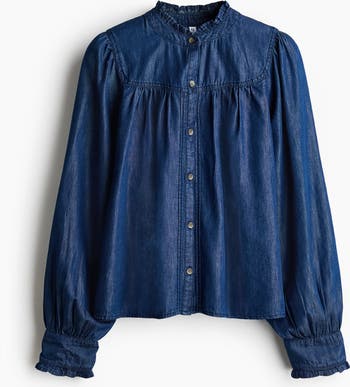 Blouse in lightweight denim made from a cotton and lyocell blend. Designed with a frilled collar, buttons down the front and a yoke with gathers at the front and back. Long puff sleeves with frill-trimmed, buttoned cuffs.