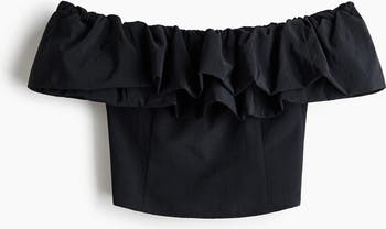 Short, sleeveless off-the-shoulder top in woven material with two wide, double layered frills and covered elastication at the top. Concealed zip at one side. Lined.