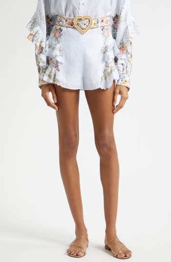 Scalloped ruffles and a heart-shaped belt buckle sweeten these lightweight linen shorts, where Camilla's hand-set diamanté sparkles shimmer across a limited-edition floral print—a tribute to the exquisite frescoes and hand-painted interiors of the Hospital de los Venerables in Seville.