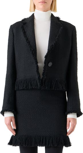 Feathery fringe lends a playful flourish to this bouclé-tweed jacket that offers a relaxed take on traditional suiting.