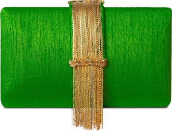 Dupioni silk fabric clutch with a cascading metallic fringe—minimal, luminous, and made to move with you. The kind of accessory that doesn’t chase attention - Just owns it!