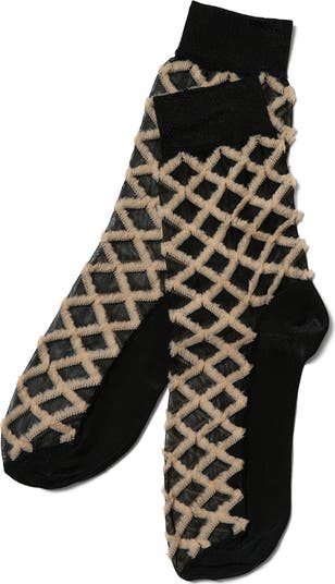 Diamond-shaped fringe offers texture and dimension for these sheer crew socks.