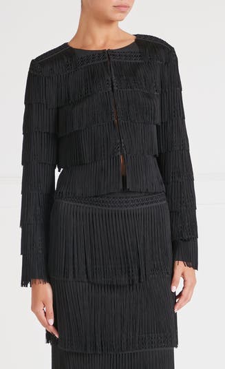 A cropped jacket with long sleeves, designed in cascading layers of fine fringe that create fluid movement. The Fringe jacket has a structured sillohuette while the tiered texture adds depth and playfulness. This story draws inspiration from the intricate crochet passementerie fringes that adorned mansion houses in the 1800s. The design reimagines historic craftsmanship into a contemporary piece with both elegance and ease.