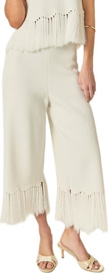 Flickering fringe gives a righteous groove to weekend ready pants offered in a soft knit