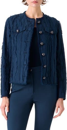 Denim-jacket design inspired the details of this jacket fashioned from a textural fringed jacquard and fronted with shiny, reflective domed buttons.