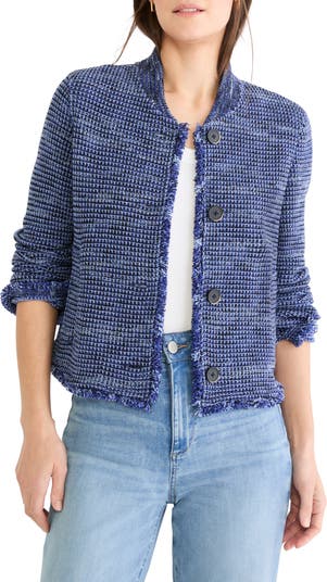 Soft and sophisticated, this cropped knit jacket is made with allover texture and finished with feathery fringed trim.