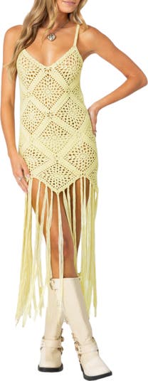 Set your boho spirit free in this airy open-knit dress punctuated with swingy fringe.