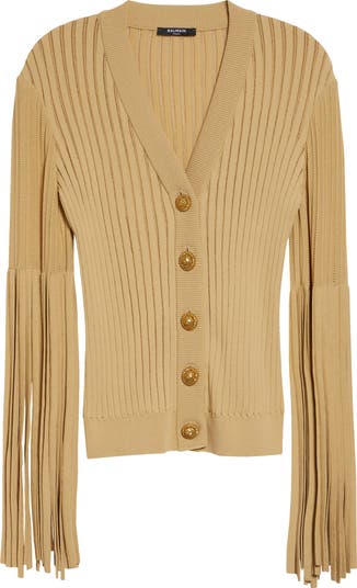 This fun and fringey cardigan is knit with ribbed pointelle stitches that separate into swishy fringe mid sleeve for a fresh approach to knit dressing. Golden crest buttons fasten down the front for a polished finish.