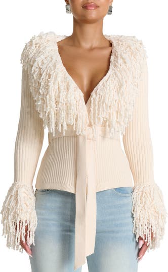 Lusciously gathered fringe add volume and movement to this close-fitting chenille cardigan made with a defining tie belt.
