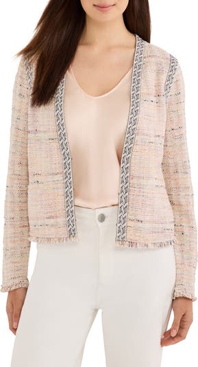 Stand out in the soft silhouette of this lightly structured jacket highlighted by contrast trim featuring an intricate jacquard pattern that nicely complements the woven body. Fringe detail at the cuffs and hems adds an extra touch of eye-catching style.