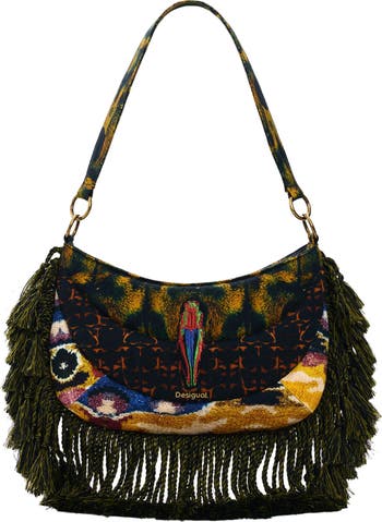 Colorful embroidery, mixed prints and fringe trim maximize the eclectic style of this outfit-making shoulder bag furnished with multiple carrying straps for added versatility.
