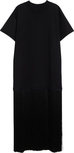 An oversized cotton T-shirt is edged with long silky fringe that reaches to the ankles on this casual-meets-evening top that reveals flashes of leg as the fringe swishes.