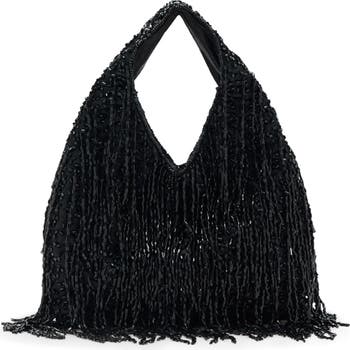 Allover beading and cascading fringe catches light and brings flapper-inspired movement to slouchy shoulder bag.