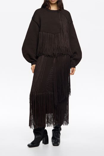 Midi skirt with all-over asymmetric fringing and elasticated inside waist