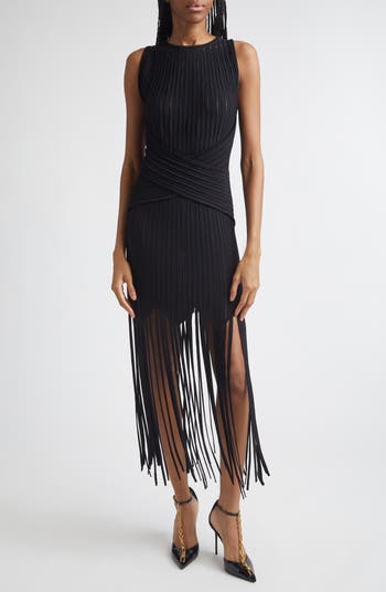 This fun and fringey sweater-dress is knit with ribbed pointelle stitches that separate into swishy fringe past the hips for a fresh approach to knit dressing. Crossover ribbed panels contour the waist on this elegant piece.