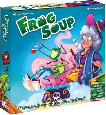 FROG SOUP, a cooperative game of jumping frongs. The Witch is cooking a frog soup, and you are the last ingredients to the receipe. So, cooperate, jump and try to spill the soup before she puts you in the cauldron. Frog Soup is a cooperative skill game where you will have to hit big targets on the table with your jumping frogs. Try to hit all the magical items in the correct sequence to remove the magical protectionsf of the Witch and escape! Beware! The Witch adds one ingredient per round in her cauldron. If she finishes her recipe (6 turns), everybody loses! Children and adults alike will have a lot of fun in playing this exciting skill based cooperative game. "Frog Soup" is a game for 1 to 4 players, ages 5 and up!