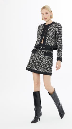 The product is designed for the fall-winter season, features a high-waisted mini length with a round neckline, long sleeves, a straight-cut silhouette, and a clasped closure, is lined and pocketless, and is made from a blend of 67% cotton and 33% polyester in a full-size pattern.