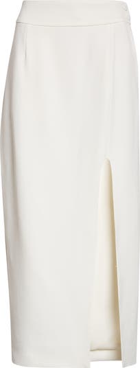 Beckham’s signature balance of allure and structure plays out in this lookbook-featured midi skirt that pauses for a front slit cut with precision. The fluid, textured fabric skims then swishes so the reveal feels timed, not accidental.