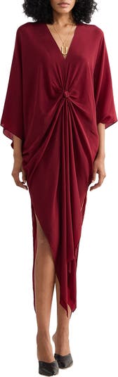 Meet your new go-to party dress - A silky burgundy kaftan stunner featuring a front twist and a flowy, breezy silhouette for that romantic look. It's lightweight, effortlessly stylish, versatile, and totally perfect for a romantic dinner or a dance party! You can pair it with any fancy footwear, accessories, and jewelry for a date-night, intimate outing, holiday party, cocktail party, or even a fancy brunch.