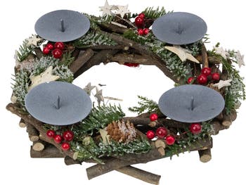 Natural elements come together to form this wonderful candle holder. The branch base supports pine sprigs, berries, and wooden star cutouts, while a light dusting of frosty glitter adds an icy feel. The perfect centerpiece addition to your holiday table. Product Features: Pine cone and twig candle holder Accented with berries, cut out stars and pine sprigs Embellished with glitter Hold up to 4 votive candles - not included For indoor use only Dimensions: 3" high x 12" diameter (measured from outermost edge to outermost edge) Inner diameter: 5" Candle tray diameter: 3" Material(s): wood/plastic/metal