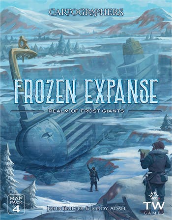 Cartographers Map Pack 4: Frozen Expanse - Realm of Frost Giants. Chill winds howl across the Frozen Expanse, where the Kaiika make their home and fearsome Frost Giants lumber through the snow. Queen Gimnax sent you to this cursed place with the fruits of a past expedition: the torn scraps of a map, partially finished by another cartographer who did not survive the journey. Now it's up to you to finish mapping the Frozen Expanse with the work of an ill-fated guildfellow to guide your way. 75 double-sided new map sheets featuring pre-scouted spaces and a frozen lake. Two new ambush cards and one new hero card. New gameplay focusing on restricted terrain placement requirements and a large gold bonus for surrounding a lake to discover an ancient relic submerged below. This map pack can be played with either Cartographers: A Roll Player Tale or Cartographers Heroes.