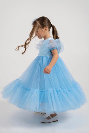 A soft, flowing tulle maxi dress completed with a smooth satin top and an elegant pearl-back detail.