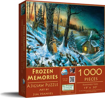 Welcome to a world of serene beauty with the Frozen Memories 1000 pc Jigsaw Puzzle by SunsOut Inc. This puzzle, artfully crafted by renowned artist Jim Hansel, exemplifies a tranquil winter night with a quiet, cozy cabin nestled in the silence of the snowy woods. When completed it measures 19" x 30", creating a breathtaking display, designed to bring art and ambiance to life. Each SunsOut Puzzle is confidently crafted using high-quality recycled cardboard and soy-based inks. These materials not only ensure durability and a seamless fit that reduces assembly frustration, but they also make a significant contribution to a healthier, more sustainable planet. The puzzles are proudly made in the USA, synonymous with superior craftsmanship and embodying a commitment to environmental consciousness. When you choose a SunsOut puzzle, you buy into an unwavering commitment to excellence, backed by a worry-free guarantee that takes care of any issues with missing or damaged pieces. This puzzle isn't just for jigsaw enthusiasts, but is also a tranquil escape into a natural winter masterpiece, creating a fulfilling journey for both mind and soul. The Frozen Memories puzzle isn’t just a puzzle to be solved; it’s an art-nature-quality fusion in one charming package, a perfectly thoughtful gift bound to enchant a quiet evening or enrich your collection. It promises delightful memories to cherish for many years to come.