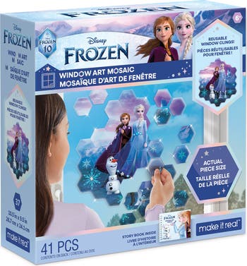 MAKE IT REAL: DISNEY WINDOW ART MOSAIC - FROZEN - The fun of a puzzle and the result of a beautiful window decal! Start in the center of the puzzle, then challenge yourself to align the hexagons to create a fun Disney Frozen mosaic! Each kit contains: precut vinyl cling pieces on printed paper backing, hexagon removal tool to make easy transitions when moving the location of a piece or pieces, a story book with pages to store the window clings, and simple instructions. When finished, admire as the sunshine illuminates the window art mosaic and brings a pop of color to the space. The window clings can also be place on windows mirrors, flat surface shower doors, and more!