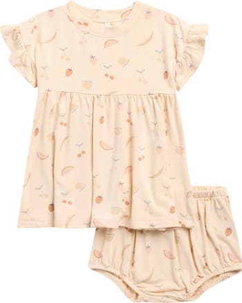 Ruffled sleeves and a pleated skirt sweeten this adorable stretch-modal dress featuring a fun fruit print and paired with matching bloomers.