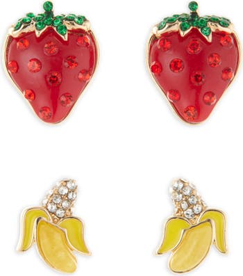 Enjoy this delectable set of strawberry and banana earrings that give a playful touch to any look.