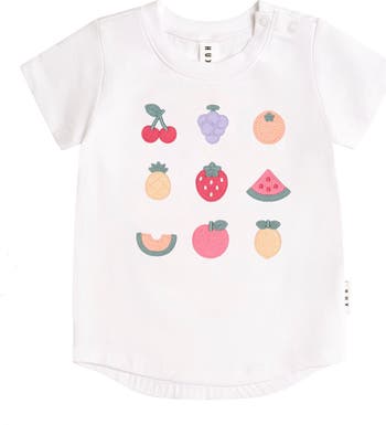 Her soon-to-be new favourite round neck tee. It's made from cloud-like organic cotton in a crisp white hue and features a fruit salad embroidery on the tummy. Made with stainless steel shoulder snaps in baby sizes for even easier dressing.