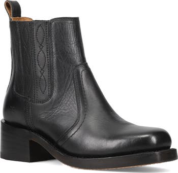 Hidden goring insets and decorative stitching add contemporary intrigue to a leather Chelsea boot balanced by a square toe and stacked block heel.