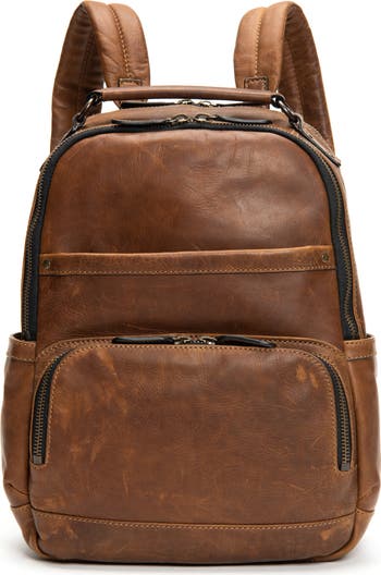 Hand-burnished, bench-crafted antique pull-up leather that softens with age and wear shapes a rugged, road-ready backpack styled in a vintage, compact style with brass-hued hardware for a touch of old-world charm.