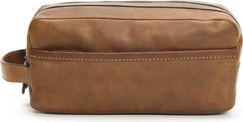 High-quality Frye leatherwork defines a strategically distressed travel kit accented with a logo-stamped patch.