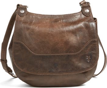 Inspired by their popular Melissa boot and made with the same attention to detail and craftsmanship, this stylish saddle bag from Frye features a topstitched leather exterior set off by antiqued brass hardware. An adjustable crossbody strap, full-length slip pocket and roomy interior with a key clip add on-the-go convenience to the rich look.